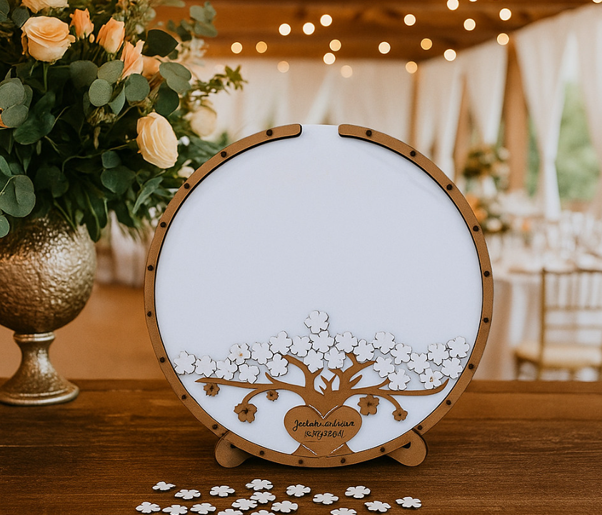 Transforme seu evento em uma lembrança inesquecível com o nosso Quadro de Assinaturas Casamento e Aniversário Redondo, projetado com um elegante tema de árvore e flores. Este quadro único não apenas embeleza sua decoração, mas também se torna um registro especial das mensagens e assinaturas dos seus convidados.